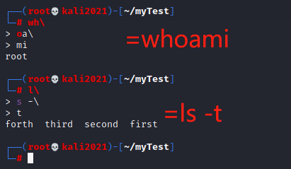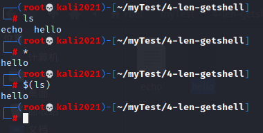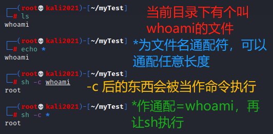 sh -c *:会把*当作命令执行,若当前目录下有一个名为whoami的文件,则用*作为文件名通配符,相当于执行sh -c whoami