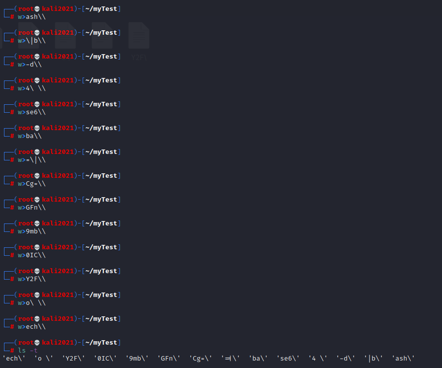 其实通篇的关键点都在于如何构造ls -t>?的命令,因为只有这样才可以让文件名按我们可以控制的顺序写入文件,然后通过sh ?去执行命令;对于文件名,因为文件名不能重复,因此当找不到替代时(比如空格可以用${IFS}替代,>可以用${PS2},+可以用${PS4}等,但是管道符|我就没找到替代方式)就需要拆解命令,将一部分命令写入比如a文件,再构造cat a|bash之类的命令构造命令执行,总之姿势很多,几乎可以构造任意shell