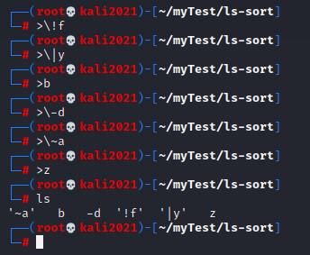 我们的主要思路还是要放在怎么构造出ls -t>0这种可以将文件名按时间顺序写入文件的指令,这是限制长度getshell的关键点